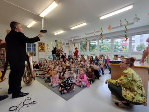 Artyści z lubelskiego biura koncertowego „Orfeusz” zapoznali przedszkolaków w sposób profesjonalny z żywą muzyką klasyczną wykonaną na harfie i tubie. Dzieci poznały budowę tych instrumentów, wysłuchały ich brzmienia solo, muzyki na nich i w duecie. Przy niektórych utworach włączały się zachęcane przez panią z zespołu – klaszcząc do rytmu wykonywanego utworu. Dzieci budowały w ten sposób swoją wrażliwość na muzykę i uczyły się słuchania muzyki klasycznej, która tworzyła oprawę do opowieści o królu mórz. Koncert ten sfinansowano ze składek na Radę Rodziców. Dziękujemy.