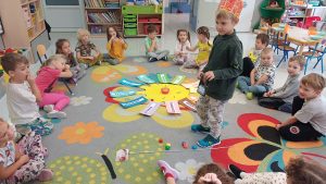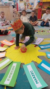 Doświadczał upływu czasu – tworząc swoją oś życia – układając zdjęcia ze swojego wcześniejszego dzieciństwa oraz obchodząc słoneczko z dwunastoma miesiącami. Chłopiec miał okazję utrwalić w pamięci datę swoich urodzin, zaprezentował swoją osobę za pomocą zdjęć i wypowiedzi słownych. Heniu jest ważnym ogniwem naszej grupy. Życzymy wszystkiego najlepszego!