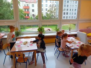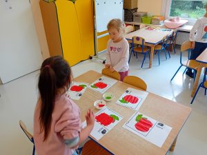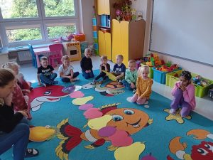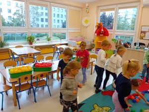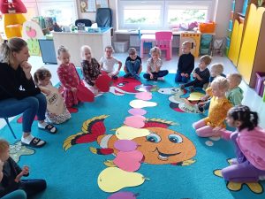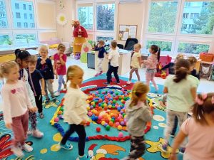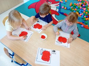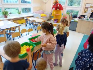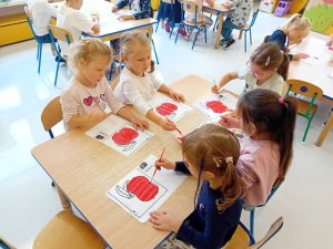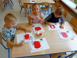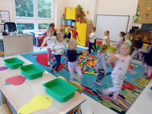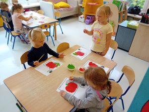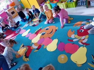 Dzieci z grupy III uczestniczyły w zajęciach pt. „W jesiennym sadzie” . Podczas zabaw: segregowały „owoce” – kolorowe piłeczki, zbierając je na sygnał i wrzucając do oznaczonych koszy, przeliczały zebrane owoce, utrwalając umiejętność liczenia, bawiły się i śpiewały przy wesołej piosence „5 rumianych jabłuszek”, na zakończenie wykonały pracę plastyczną „Czerwone jabłuszko”. Dzieci z radością uczestniczyły w zajęciach, rozwijając spostrzegawczość, koordynację ruchową oraz umiejętności matematyczne i plastyczne.