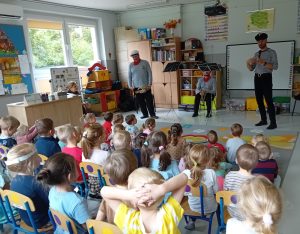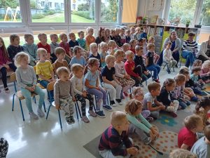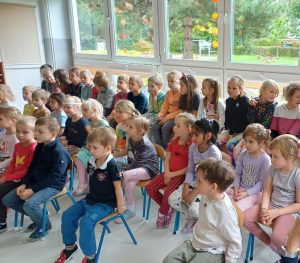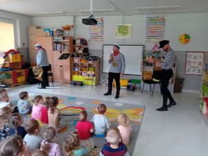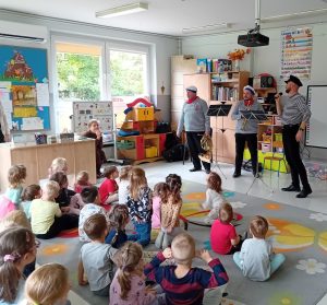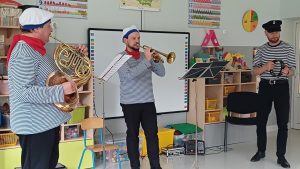 W dniu 08.10.25r. dzieci z naszego przedszkola wzięły udział w wyjątkowym koncercie muzycznym pt. „Pan Maluśkiewicz na morzu pełnym dźwięków” ( pierwszym z cyklu koncertów „W Krainie Pani Muzyki”). Była to niezwykła opowieść muzyczna, w której główną rolę odegrały róg i trąbka. Mali słuchacze przenieśli się w świat morskich przygód bohatera – Pana Maluśkiewicza – poznając bogactwo dźwięków, rytmów i barw muzycznych. Dzięki koncertowi dzieci miały okazję: posłuchać gry na instrumentach dętych, dowiedzieć się, jak powstają dźwięki w rogu i trąbce, rozwijać wrażliwość muzyczną oraz wyobraźnię. To była fascynująca podróż po morzu pełnym muzyki i niezapomniane spotkanie ze światem instrumentów!