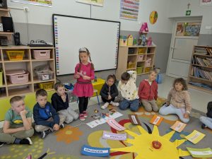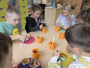 Dziewczynka układała zdjęcia ze swojego wcześniejszego dzieciństwa, obchodząc słoneczko z dwunastoma miesiącami. Tosia przyniosła własnoręcznie zrobione, pyszne babeczki, którymi poczęstowała całą grupę. Życzymy wszystkiego najlepszego!
