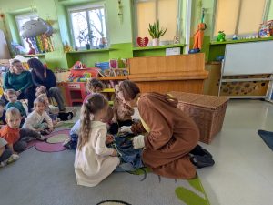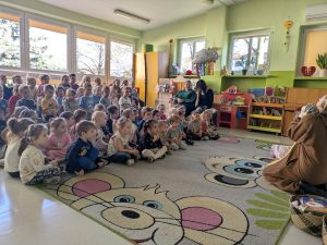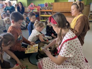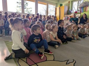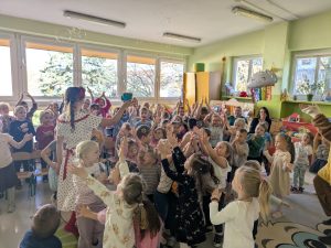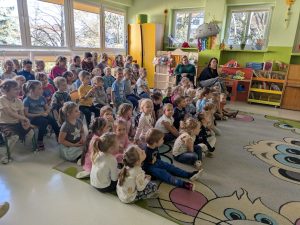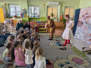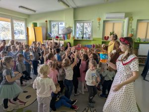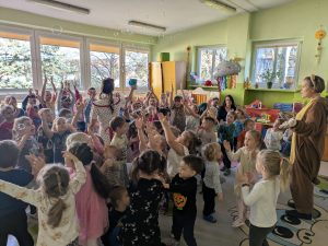 4 listopada 2025 r. dzieci z całego przedszkola obejrzały spektakl teatralny, pt. „Przytul mnie, misiu” w wykonaniu Teatru „POMPON”. Dzieci miały okazję dowiedzieć się jak i dlaczego szanować książki oraz zabawki. Przedszkolaki uczestniczyły również w zabawach muzycznych z aktorami:).