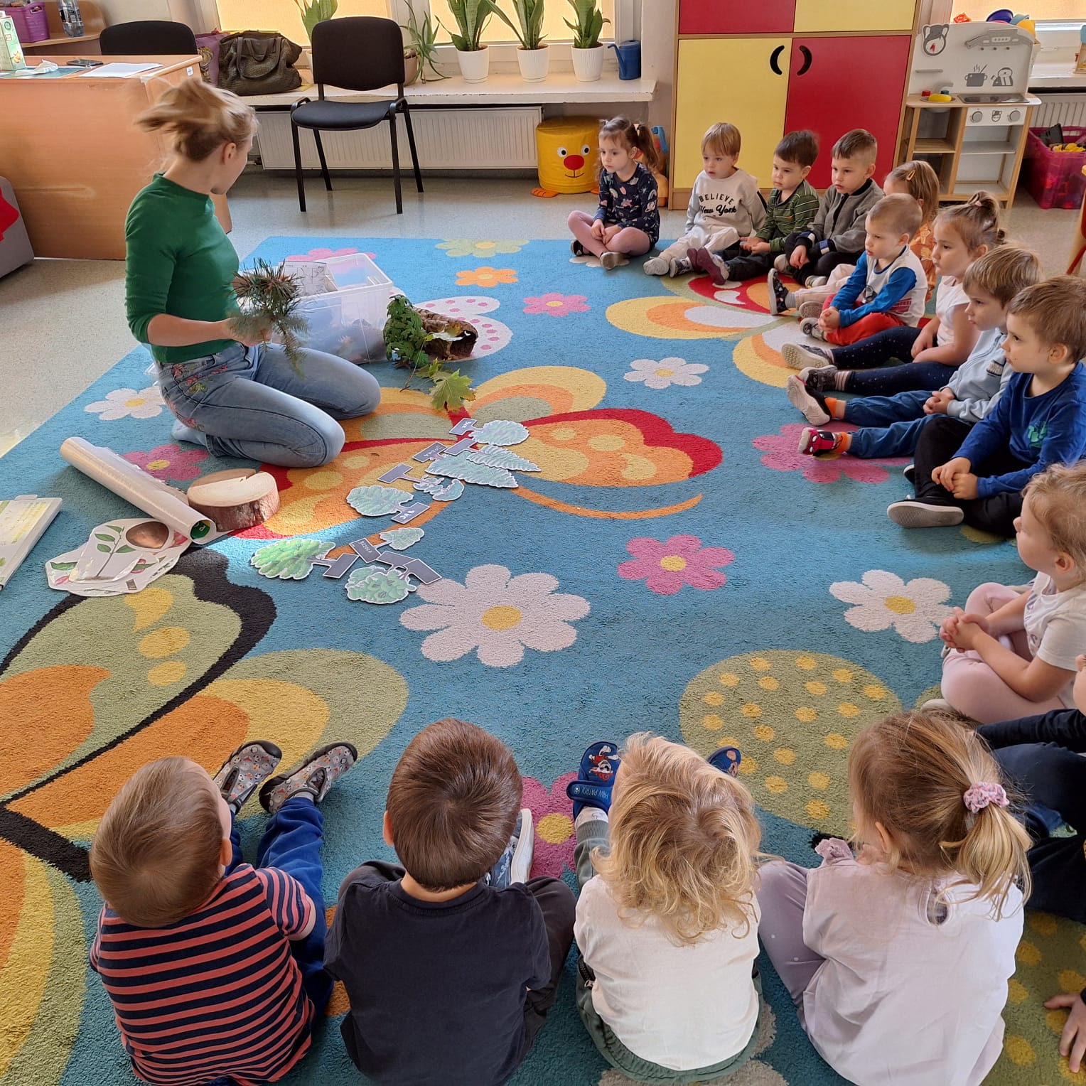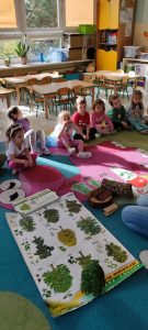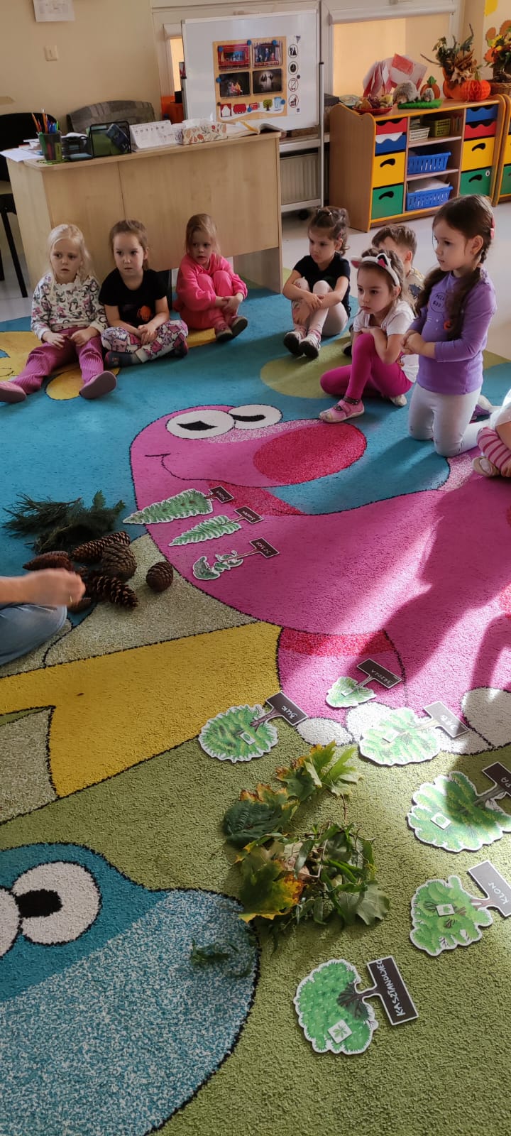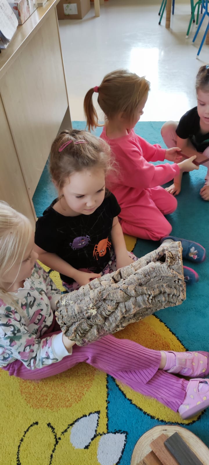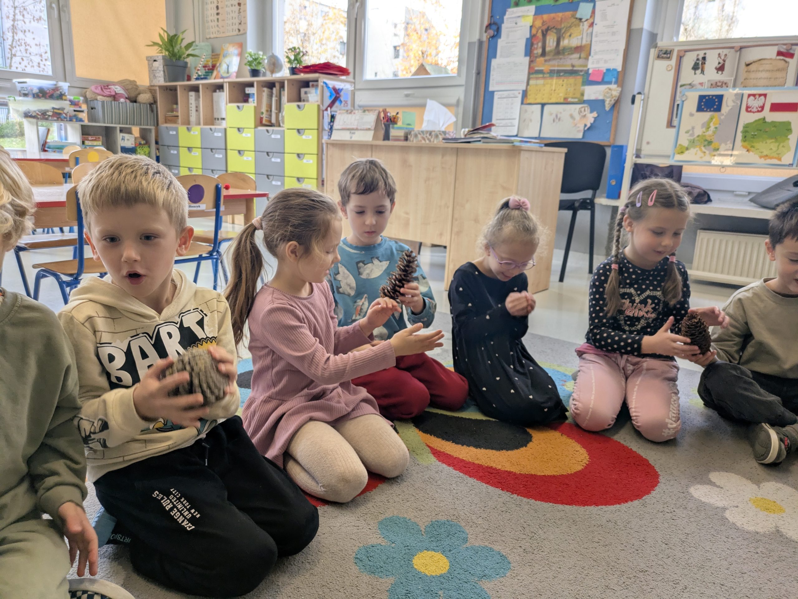 05.11.25 r. Dzieci z wszystkich grup przedszkolnych brały udział w ciekawych warsztatach przyrodniczych , pt. „Między nami drzewami – poznajemy bliżej nasze drzewa” . Przedszkolaki dowiedziały się czym różnią się drzewa iglaste od liściastych, jak są zbudowane, z czego wyrastają i jakie dają owoce. Przy pomocy zmysłów dotyku, węchu i wzroku poznały: drzewa, szyszki i korę oraz budowę drzewa od środka, nauczyły się również sposobu liczenia wieku drzew. Dzieci zwiększyły swoją wiedzę i świadomość na temat tego, jak ważne i potrzebne są drzewa dla ludzi i zwierząt.