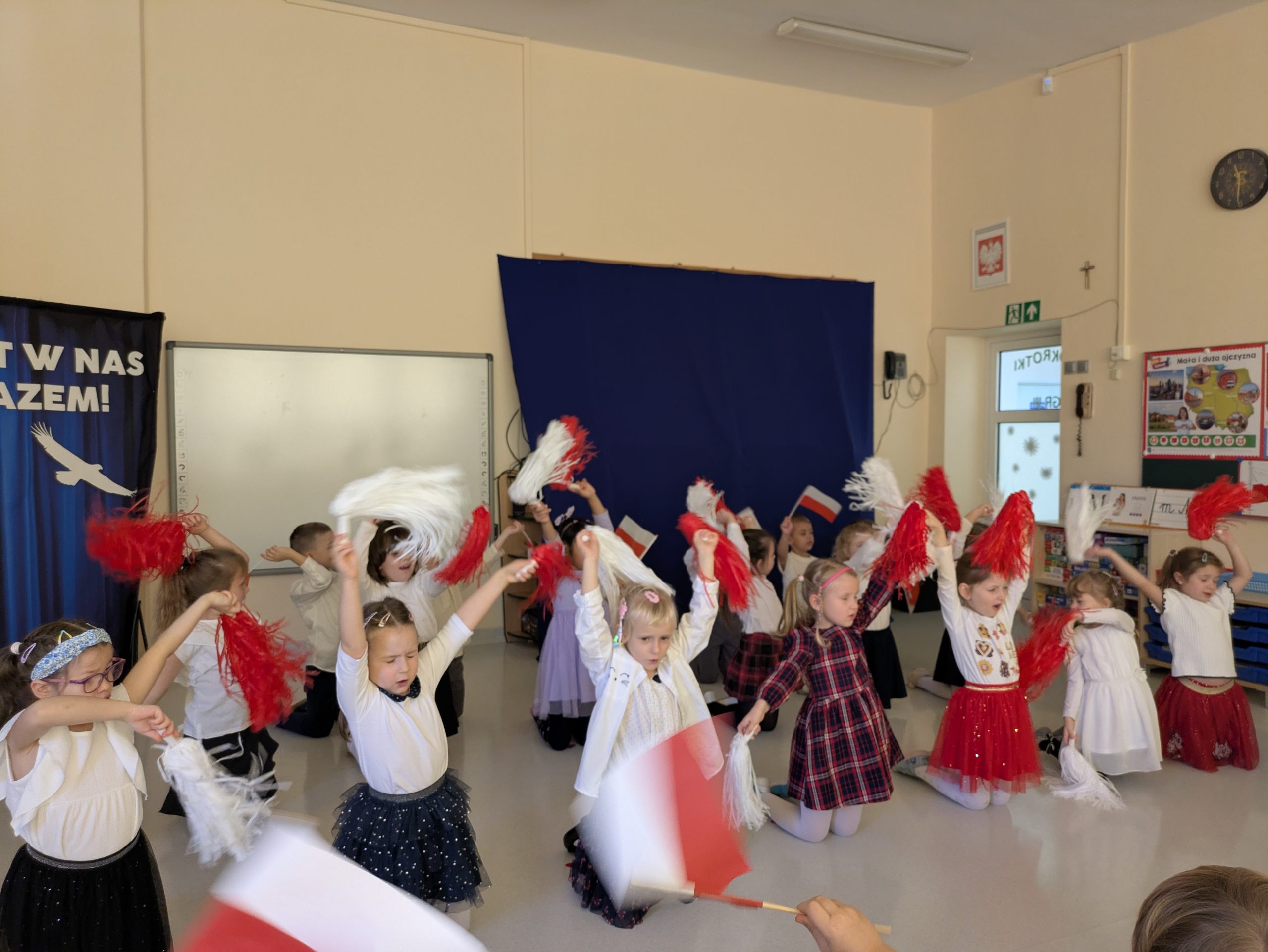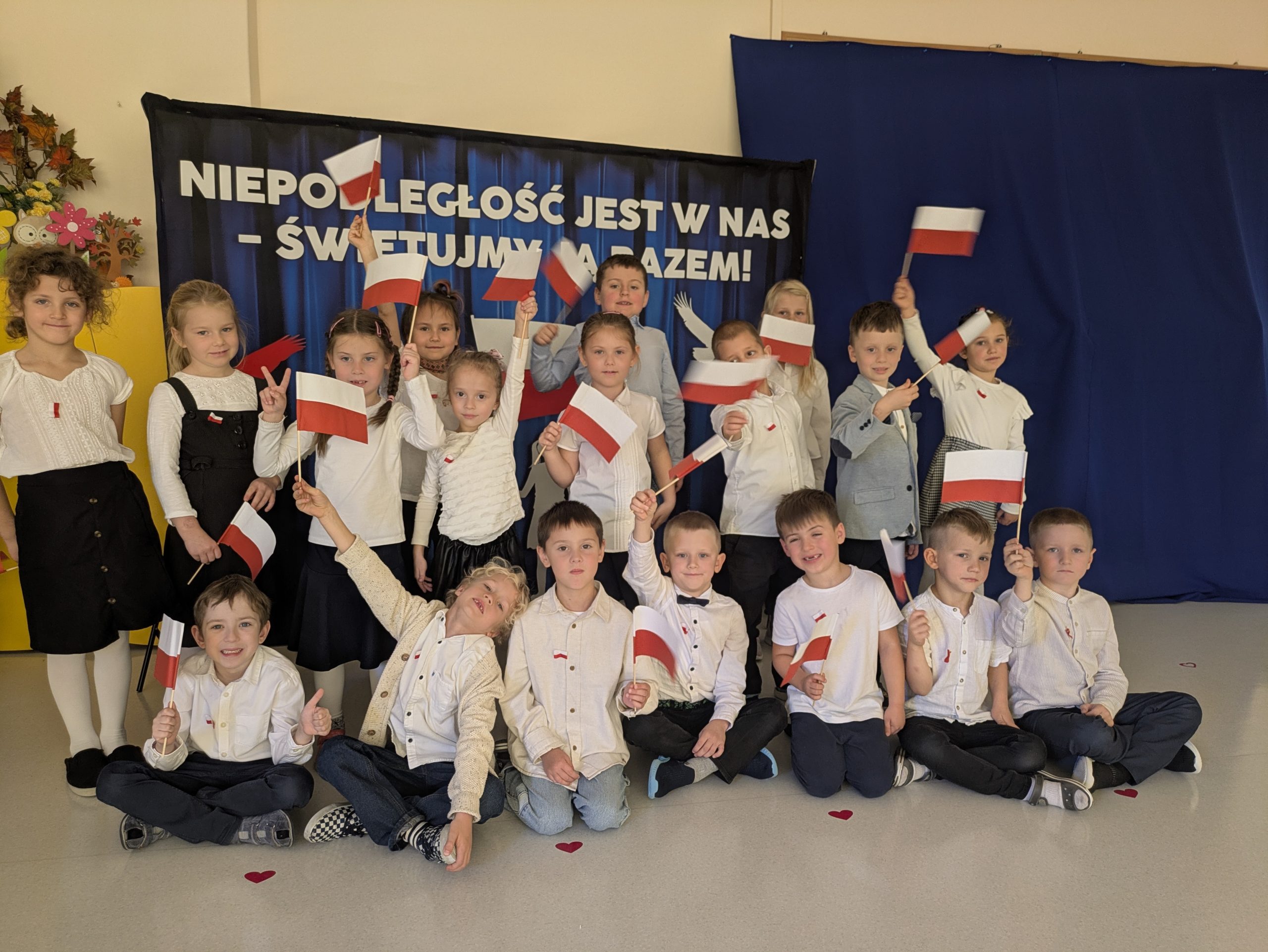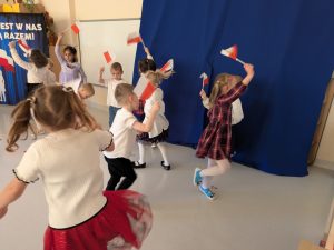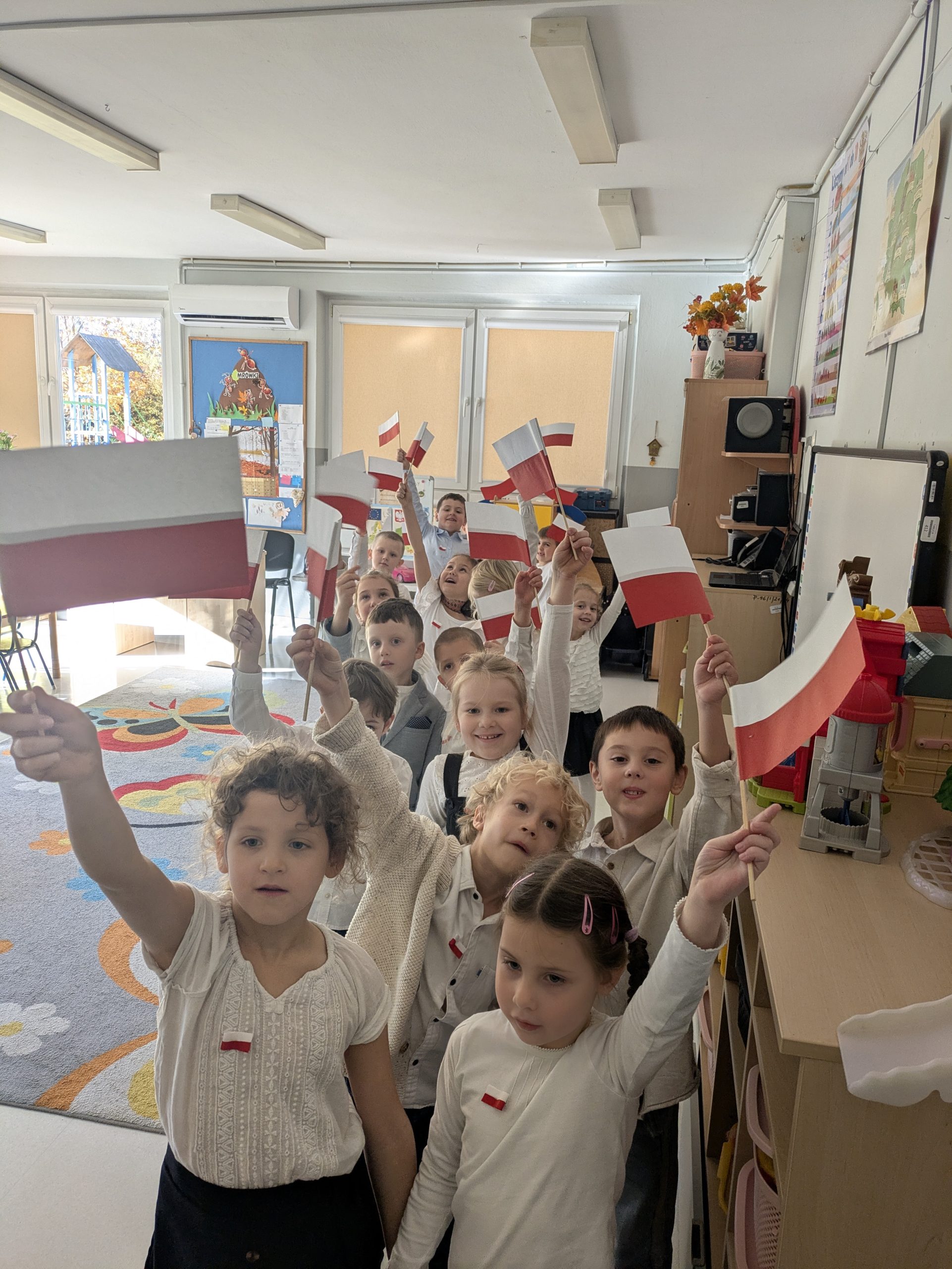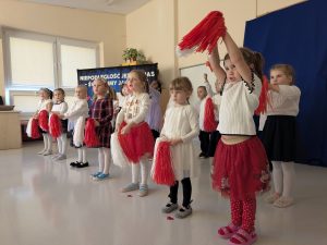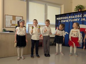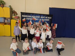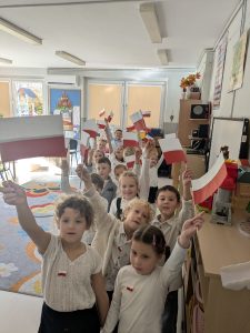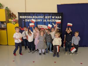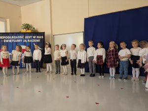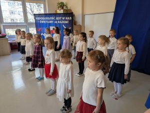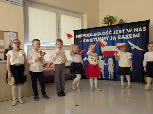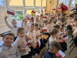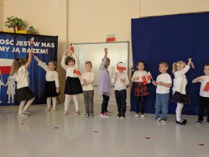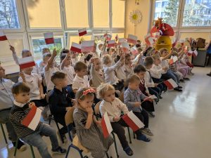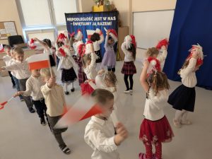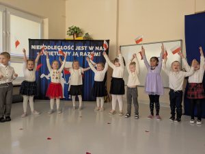 Dnia 07.11.2025 r. dzieci z grupy I, II i IV uczestniczyły w występach przygotowanych przez grupę III z okazji Święta Niepodległości. Spotkanie rozpoczęło się uroczystym odśpiewaniem o godz. 11:11 „Mazurka Dąbrowskiego” w ramach akcji „Szkoła do hymnu”. Następnie Stokrotki zaprezentowały piosenki, wiersze i tańce o tematyce patriotycznej.