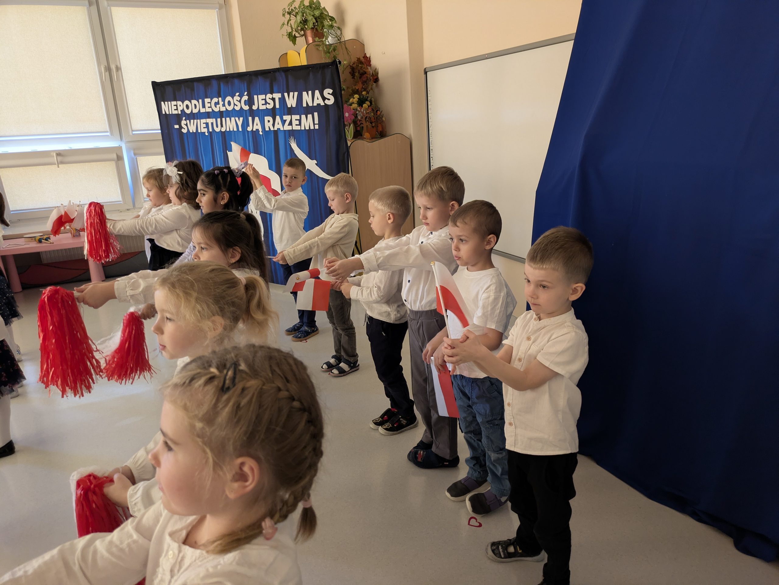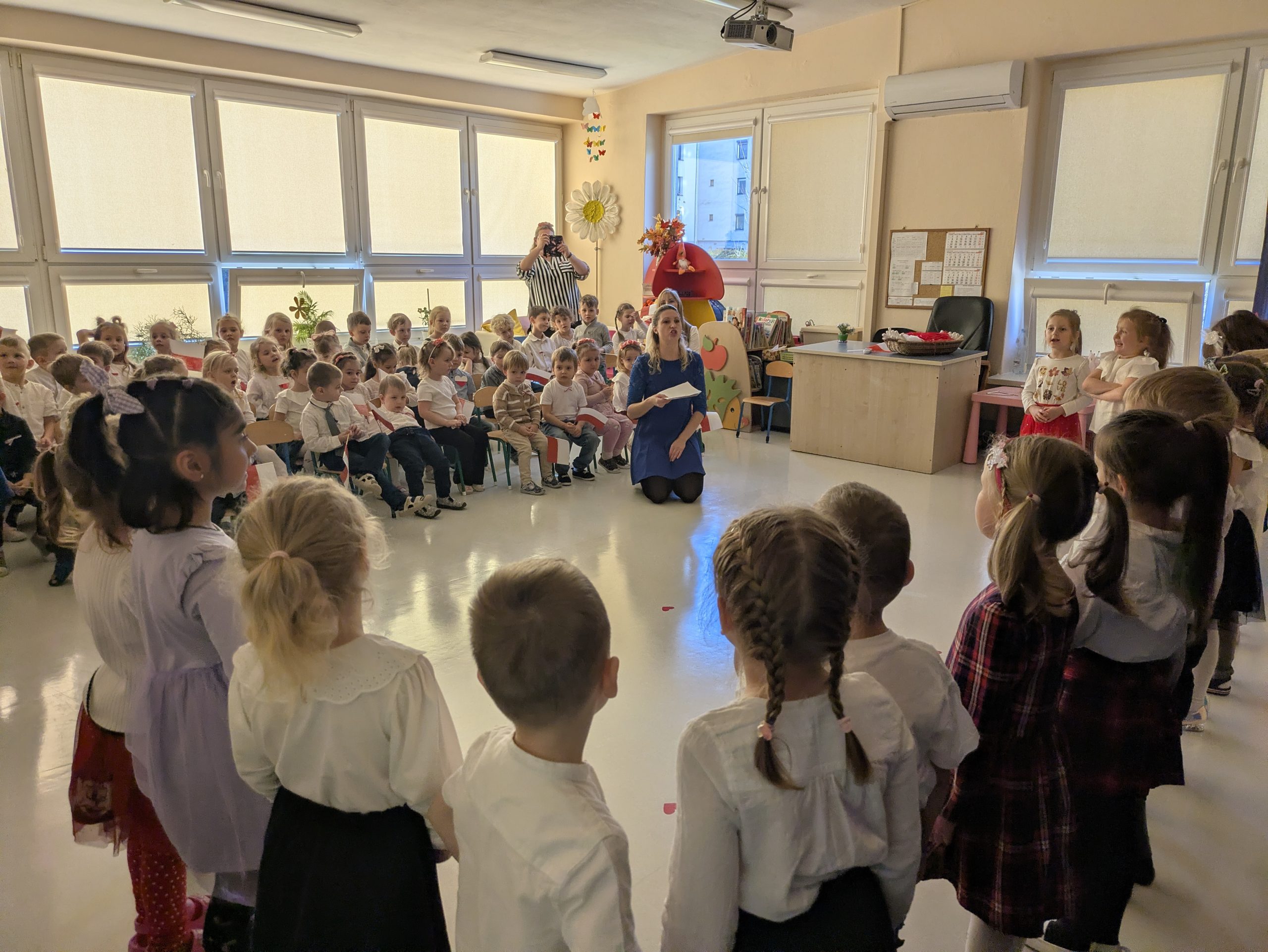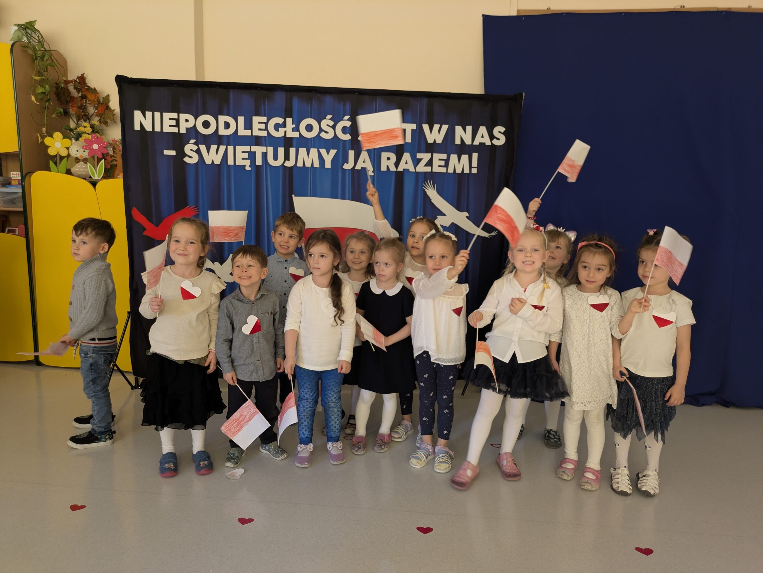 Dnia 07.11.2025 r. dzieci z grupy I, II i IV uczestniczyły w występach przygotowanych przez grupę III z okazji Święta Niepodległości. Spotkanie rozpoczęło się uroczystym odśpiewaniem o godz. 11:11 „Mazurka Dąbrowskiego” w ramach akcji „Szkoła do hymnu”. Następnie Stokrotki zaprezentowały piosenki, wiersze i tańce o tematyce patriotycznej.
