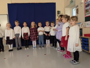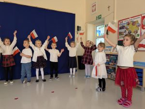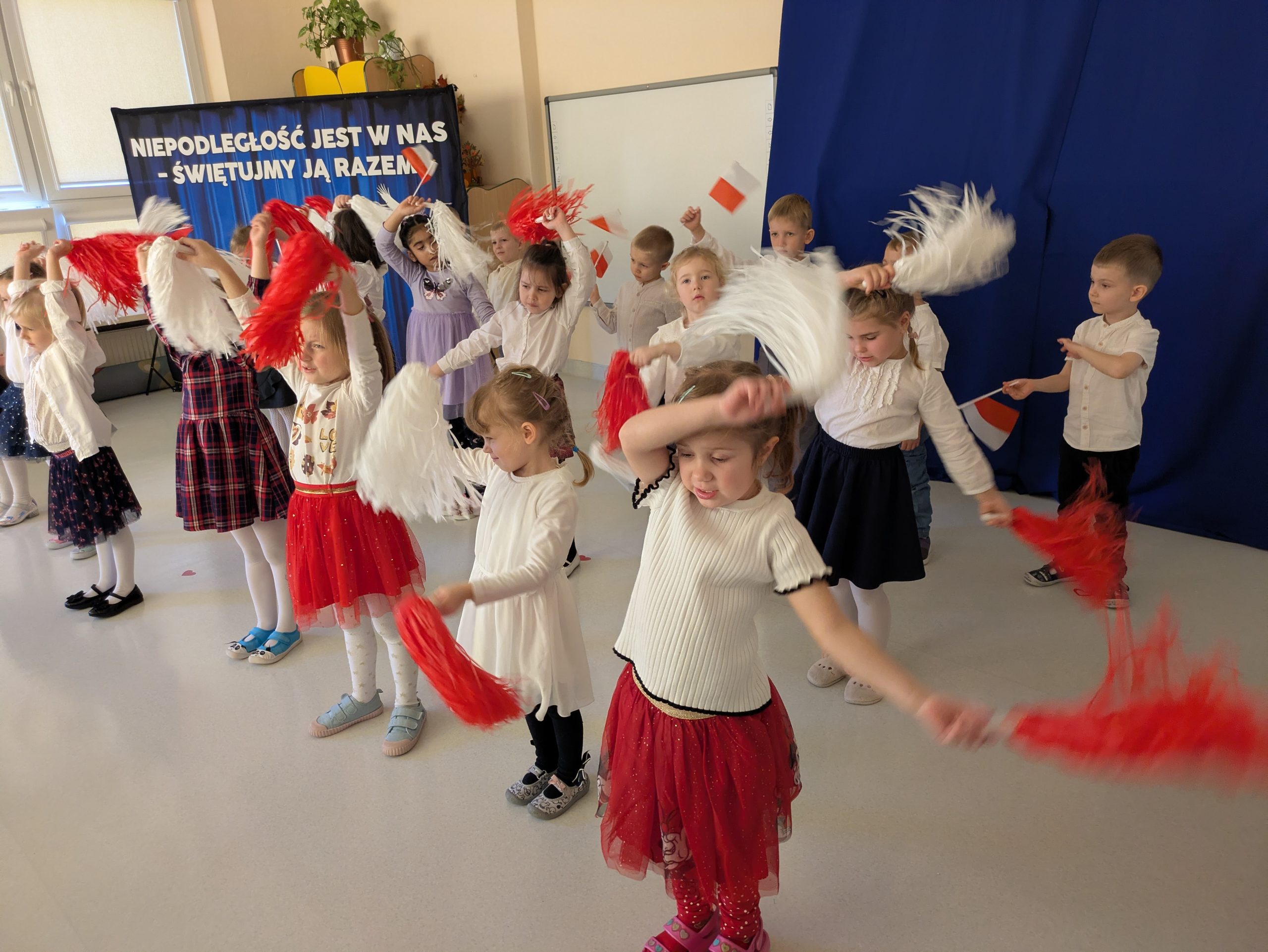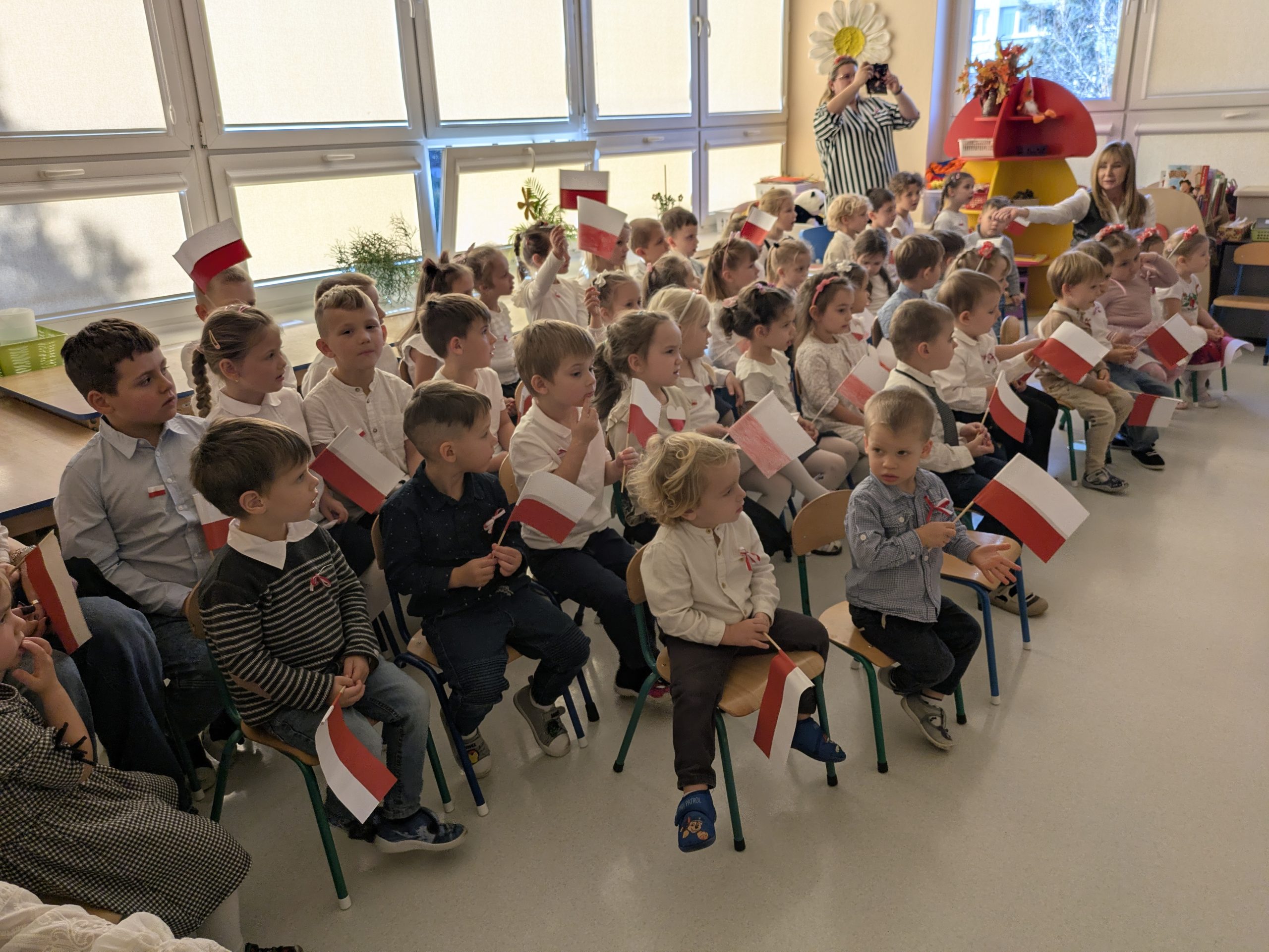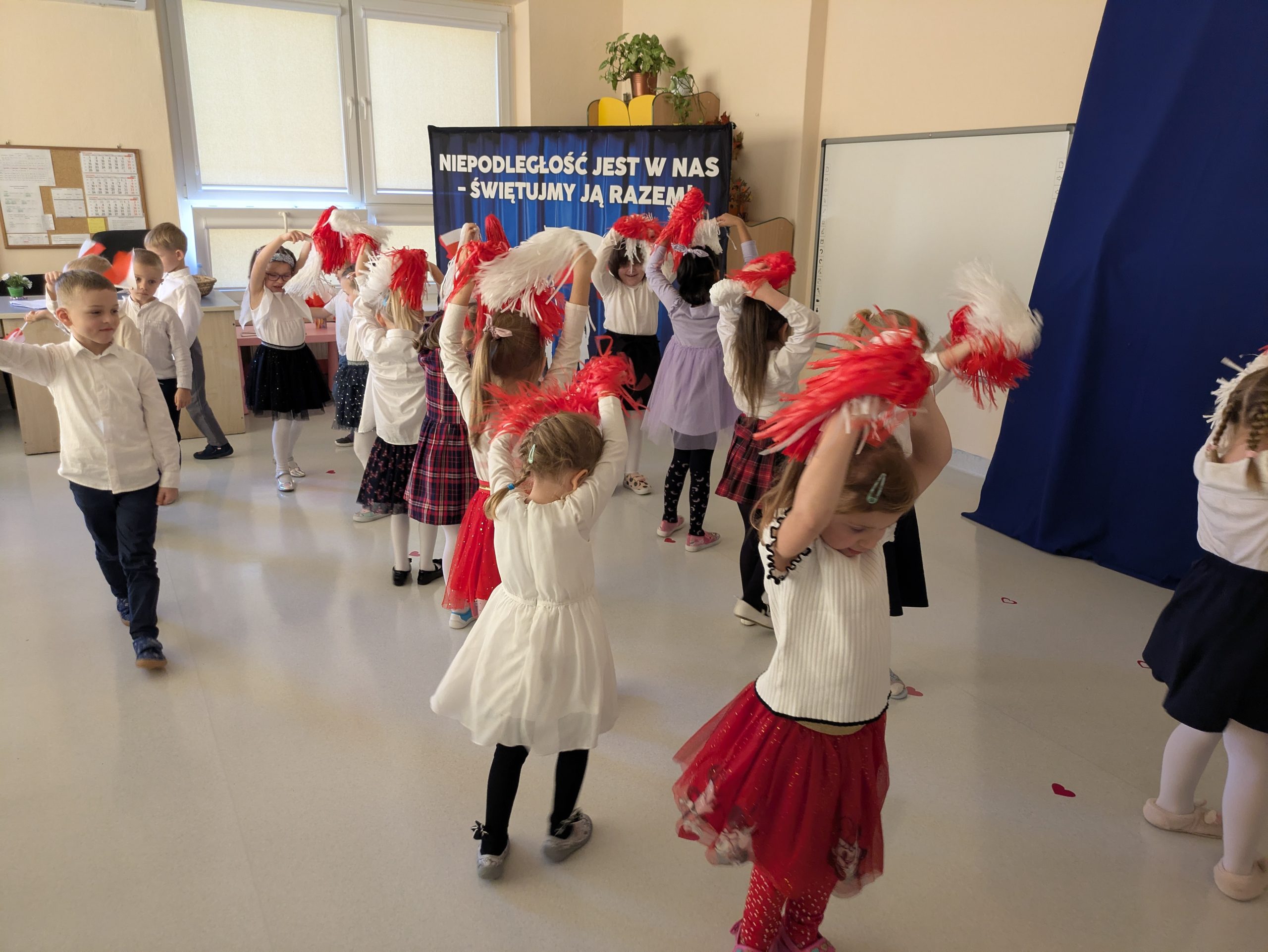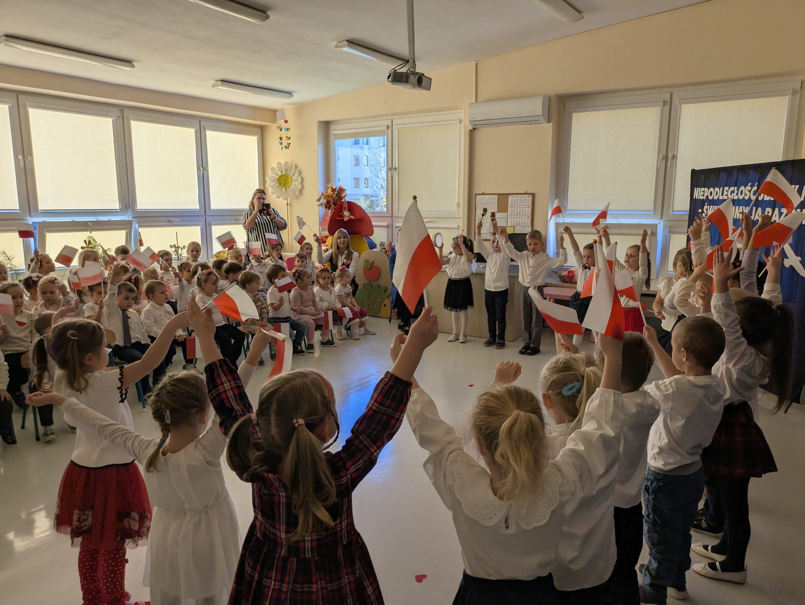 Dnia 07.11.2025 r. dzieci z grupy I, II i IV uczestniczyły w występach przygotowanych przez grupę III z okazji Święta Niepodległości. Spotkanie rozpoczęło się uroczystym odśpiewaniem o godz. 11:11 „Mazurka Dąbrowskiego” w ramach akcji „Szkoła do hymnu”. Następnie Stokrotki zaprezentowały piosenki, wiersze i tańce o tematyce patriotycznej.