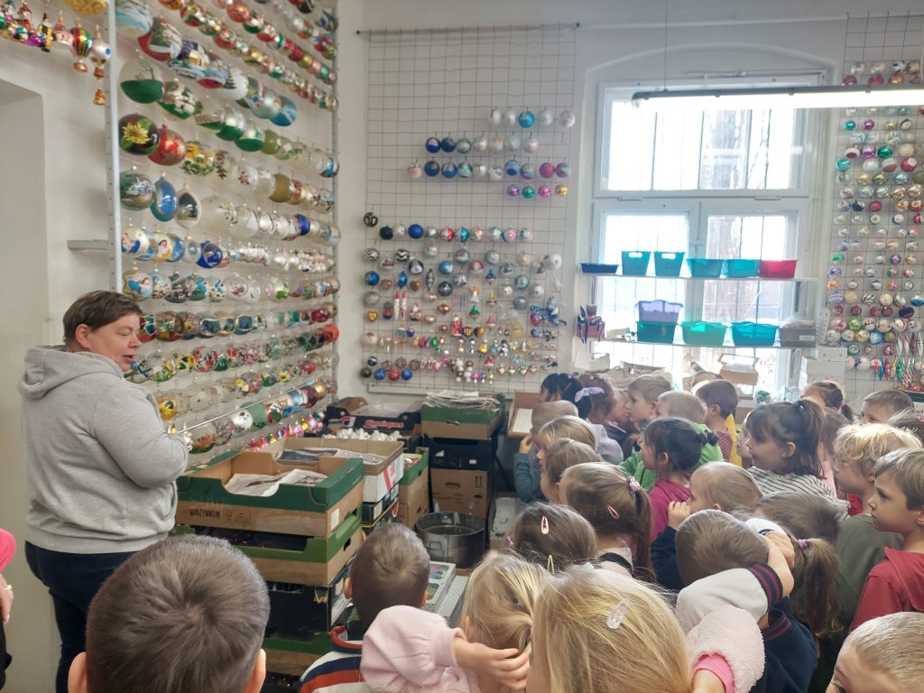 28.11.2025r. dzieci z grup Mrówek i Stokrotek uczestniczyły w autokarowej wycieczce do fabryki bombek w Krośnicach. Podczas wizyty miały okazję zobaczyć cały proces tworzenia tradycyjnych bombek choinkowych od wydmuchiwania szkła, przez srebrzenie i farbowanie, aż po ręczne dekorowanie.