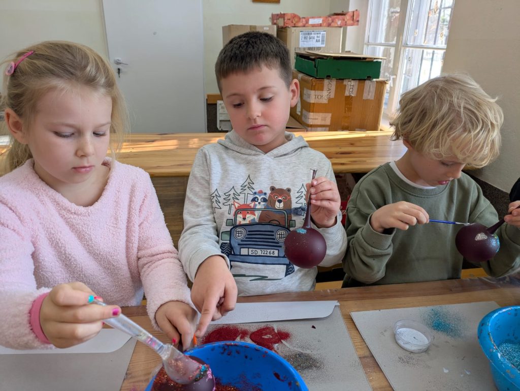 Na zakończenie wycieczki każde dziecko mogło samodzielnie udekorować brokatem bombki według własnego pomysłu. Gotowe ozdoby dzieci zabrały ze sobą do domu, gdzie będą mogły przystroić nimi swoje świąteczne drzewka.