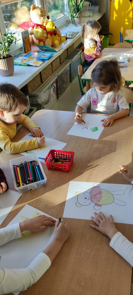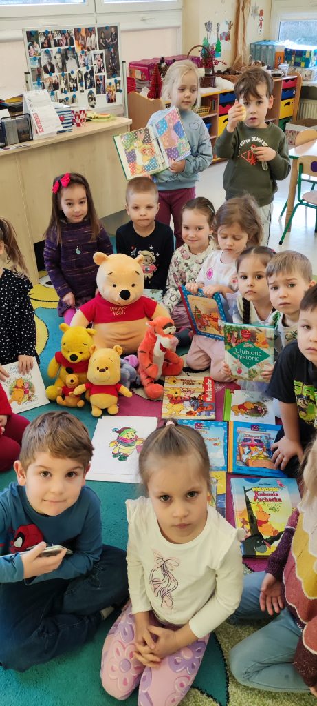 Dziś 19.01.26r. obchodzimy w grupie Żabek Dzień Kubusia Puchatka (jego urodziny obchodzone są 18.01.). Dzieci przyniosły swoje maskotki, kolorowanki. książeczki. Żabki poznały historię powstania opowieści o misiu, a następnie rysowały portret Kubusia.