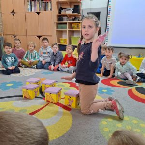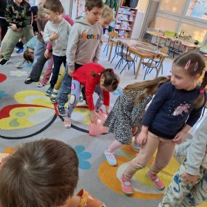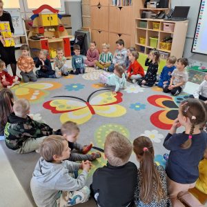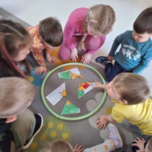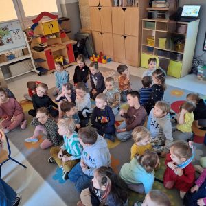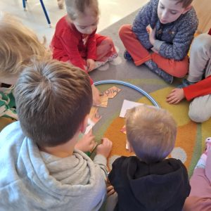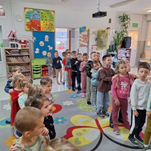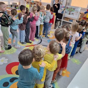 W trakcie zajęć nie zabrakło także ćwiczeń artykulacyjnych z Kubusiem, podczas których dzieci usprawniały aparat mowy poprzez zabawy buzi i języka, naśladowanie odgłosów oraz wesołe „misiowe” ćwiczenia oddechowe. Przedszkolaki rozwiązywały zagadki, układały puzzle, wykonywały prace plastyczne i uczestniczyły w zabawach ruchowych.