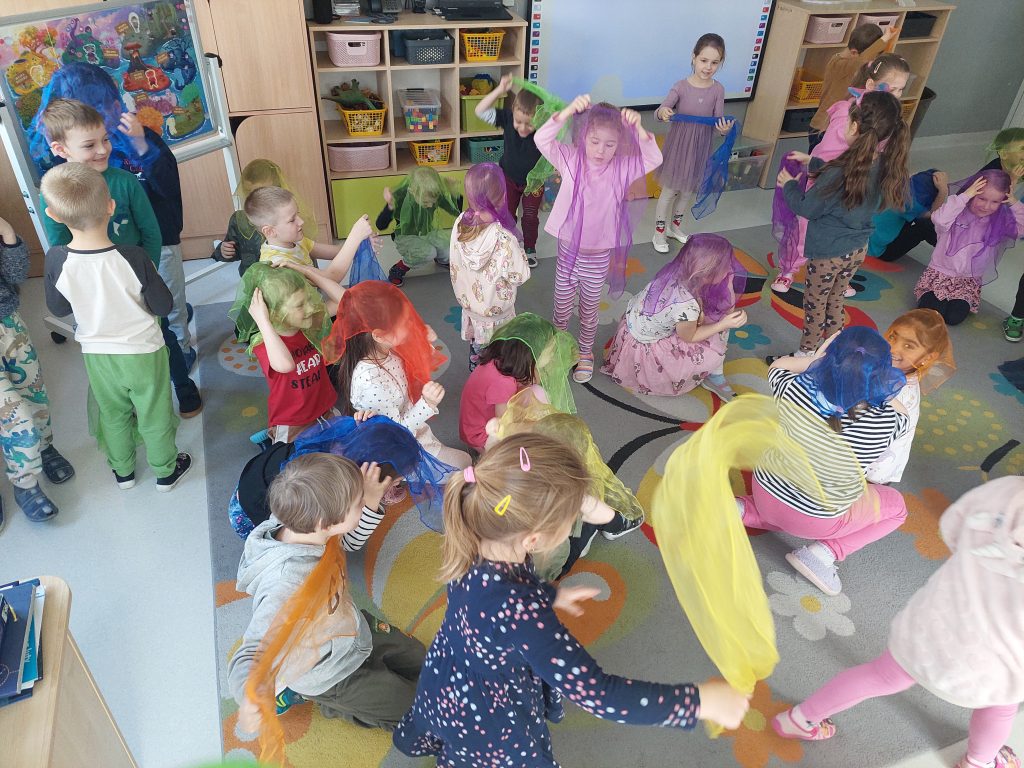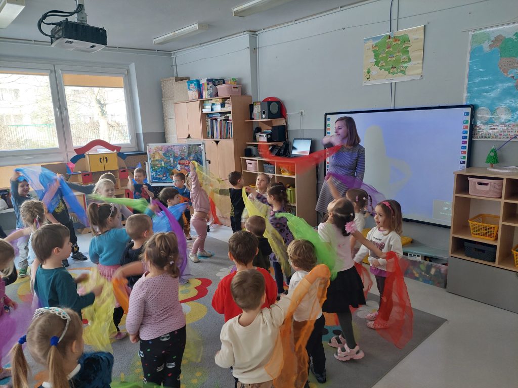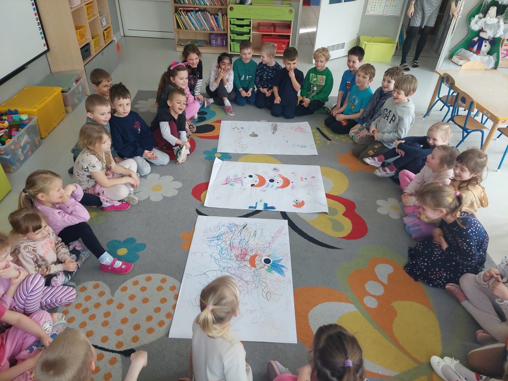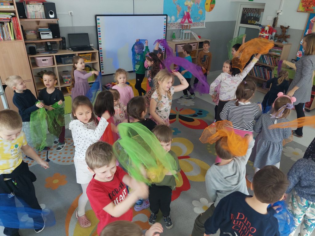 Dnia 19.02.2026r. wszystkie grupy przedszkolne wzięły udział w spotkaniu w ramach projektu „Czuciaki z Krainy Emocji”, na którym poznały kolejnego bohatera – Bojka z wyspy Strachu. Na zajęciach dzieci dowiedziały się jaką rolę w naszym życiu odgrywa strach oraz dlaczego jest on nam potrzebny. Podczas zabaw z chustkami sensorycznymi przedszkolaki wyrażały ruchem różne emocje, a przy pomocy zabawy plastycznej poznawały różne sposoby radzenia sobie ze strachem.