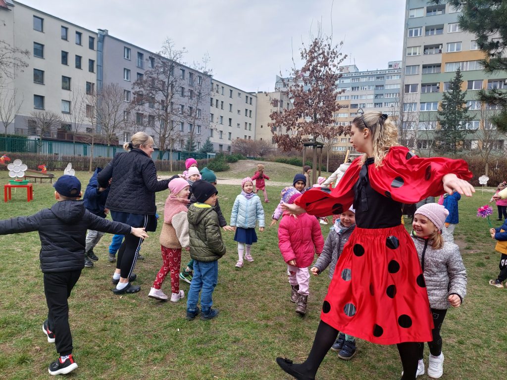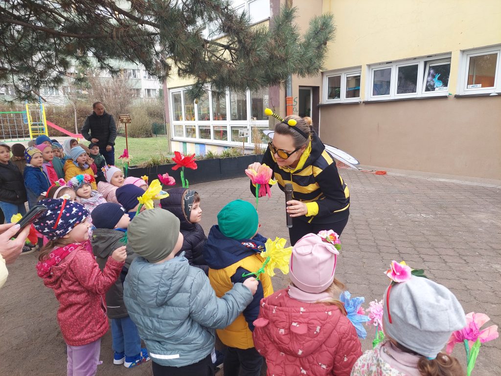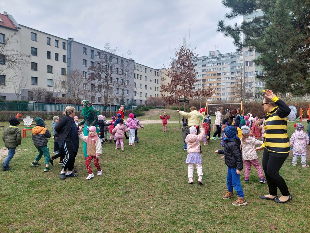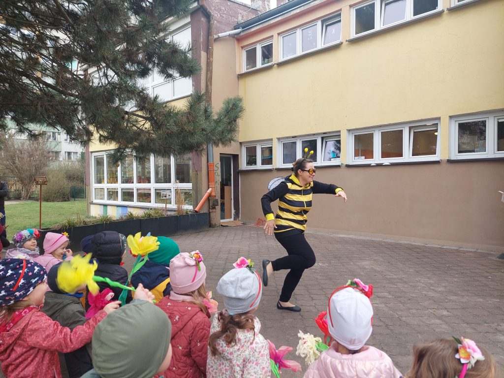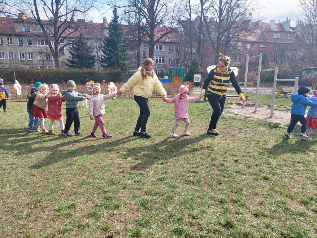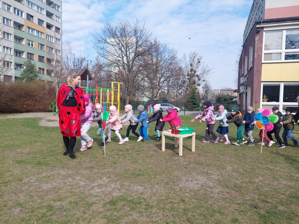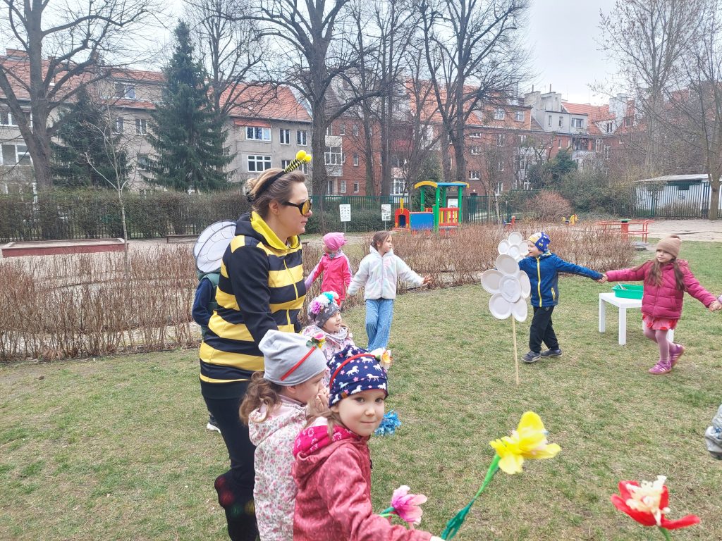 Wiosną owady wybudzają się z zimowej hibernacji (pauzy), opuszczają swoje kryjówki – korę drzew, ściółkę, mrowiska czy domowe zakamarki – i intensywnie poszukują pożywienia i miejsc do rozrodu. O godz.10:00 wszystkie przedszkolaki spotykały się w ogrodzie przedszkolnym, gdzie czekała na nich pięknie ukwiecona Pani Wiosna. Na taras przyleciała pszczoła i opowiadała dzieciom, że nie spała całą zimę tylko ogrzewała królową i siostry w ulu. Bardzo głodna dostrzega kwiatki i zaczęła zbierać pyłek. Dzieci zaśpiewały wesołą piosenkę i postanowiły obudzić pozostałe owady motyla i biedronkę. Po gromkim śpiewie na wybudzenie biedronka opowiedziała co robi wiosną i dlaczego nie je nektaru z kwiatków jak motyl i pszczoła. Motylek również wyjaśnił jaką aktywność ma na wiosną. Podczas zabawy z elementami scenek teatralnych i przy muzyce dzieci miały możliwość rozwijania zainteresowań otaczającym środowiskiem przyrodniczym oraz zachodzącymi w nim zmianami. Dzieci zostały zachęcone do pomalowania stojących papierowych kwiatów. Malowanie farbami, tańce i zabawy na świeżym powietrzu integrowały całą społeczność przedszkolną we wspólnym przeżywaniu witania wiosny.