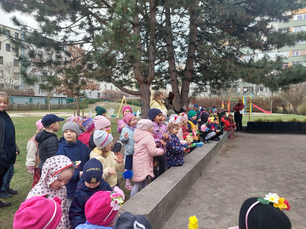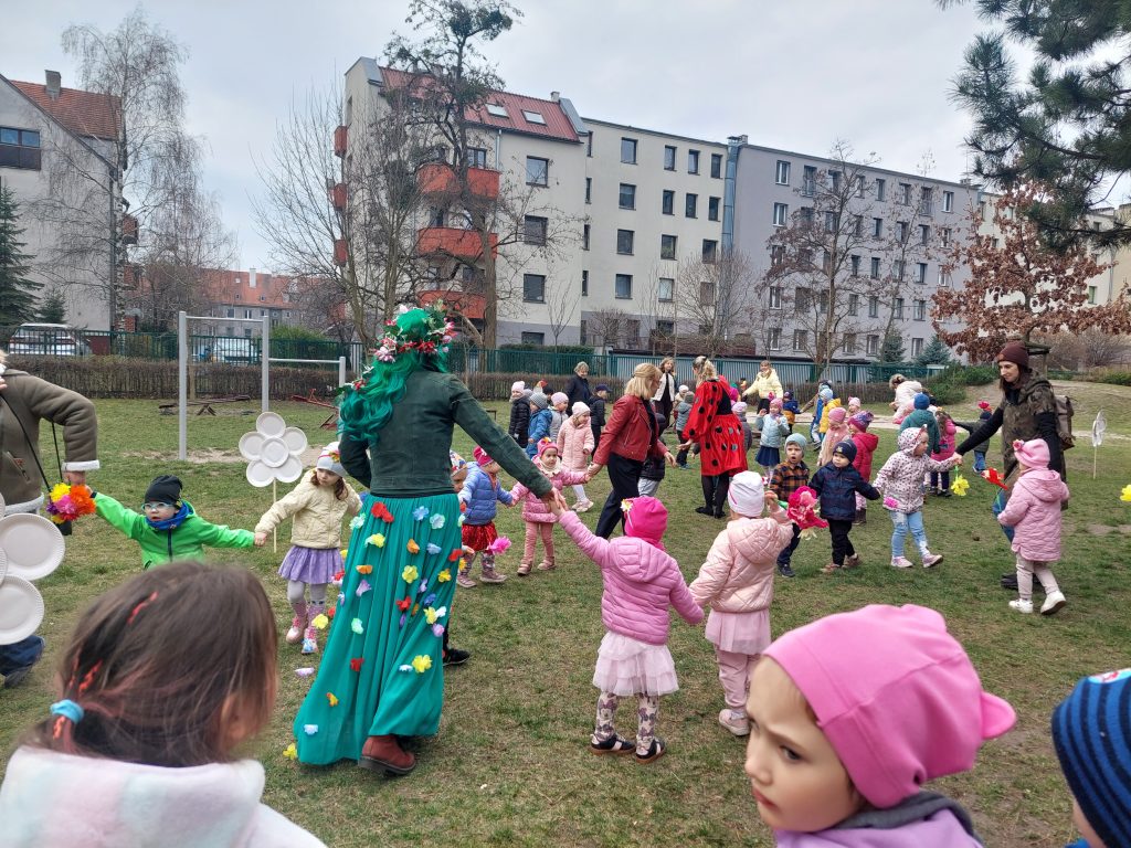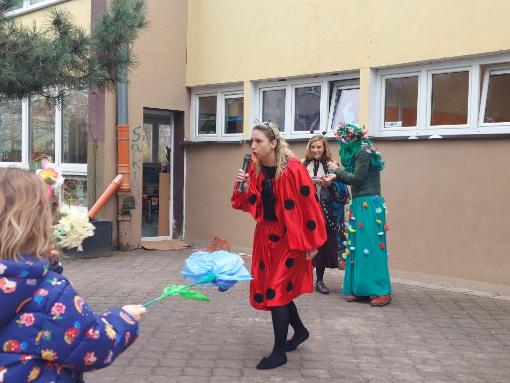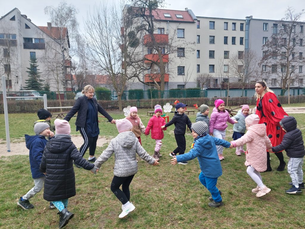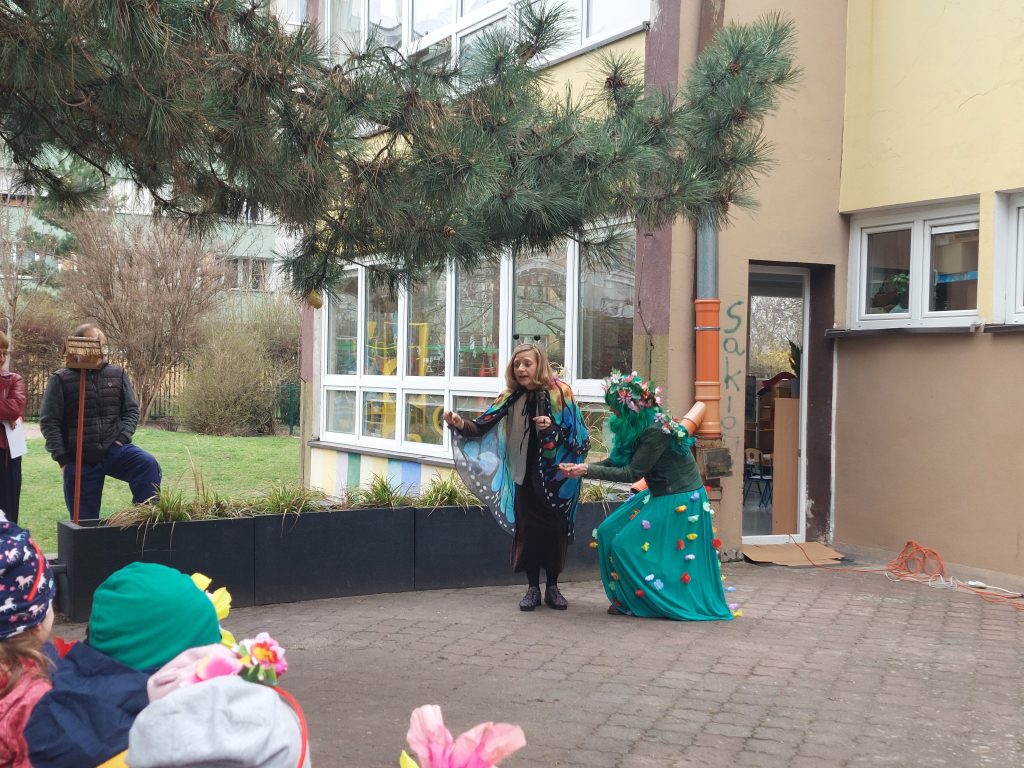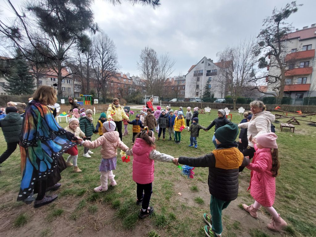 Wiosną owady wybudzają się z zimowej hibernacji (pauzy), opuszczają swoje kryjówki – korę drzew, ściółkę, mrowiska czy domowe zakamarki – i intensywnie poszukują pożywienia i miejsc do rozrodu. O godz.10:00 wszystkie przedszkolaki spotykały się w ogrodzie przedszkolnym, gdzie czekała na nich pięknie ukwiecona Pani Wiosna. Na taras przyleciała pszczoła i opowiadała dzieciom, że nie spała całą zimę tylko ogrzewała królową i siostry w ulu. Bardzo głodna dostrzega kwiatki i zaczęła zbierać pyłek. Dzieci zaśpiewały wesołą piosenkę i postanowiły obudzić pozostałe owady motyla i biedronkę. Po gromkim śpiewie na wybudzenie biedronka opowiedziała co robi wiosną i dlaczego nie je nektaru z kwiatków jak motyl i pszczoła. Motylek również wyjaśnił jaką aktywność ma na wiosną. Podczas zabawy z elementami scenek teatralnych i przy muzyce dzieci miały możliwość rozwijania zainteresowań otaczającym środowiskiem przyrodniczym oraz zachodzącymi w nim zmianami. Dzieci zostały zachęcone do pomalowania stojących papierowych kwiatów. Malowanie farbami, tańce i zabawy na świeżym powietrzu integrowały całą społeczność przedszkolną we wspólnym przeżywaniu witania wiosny.