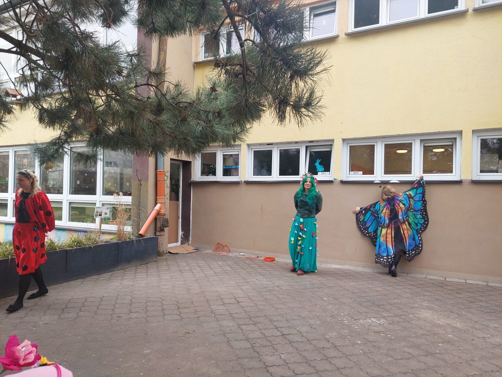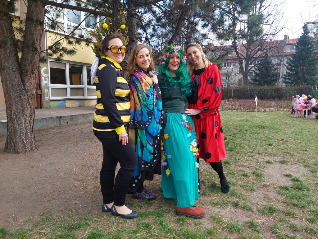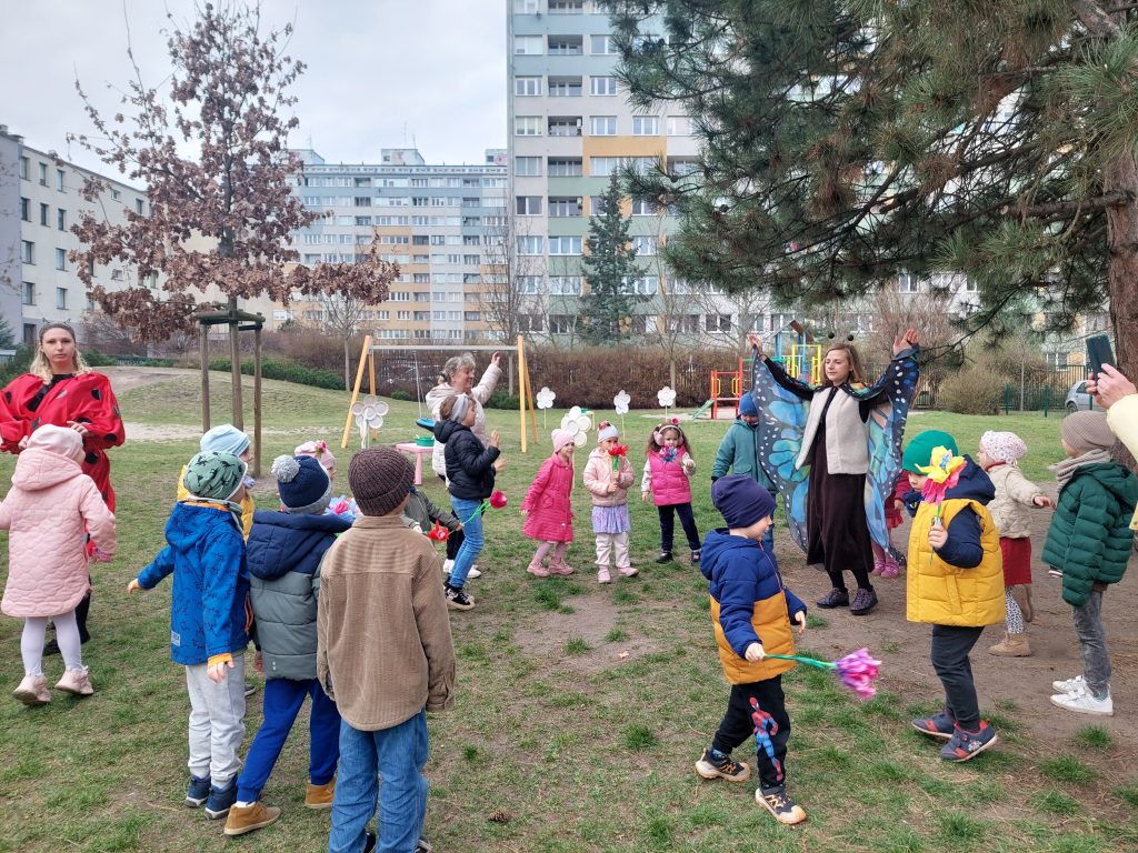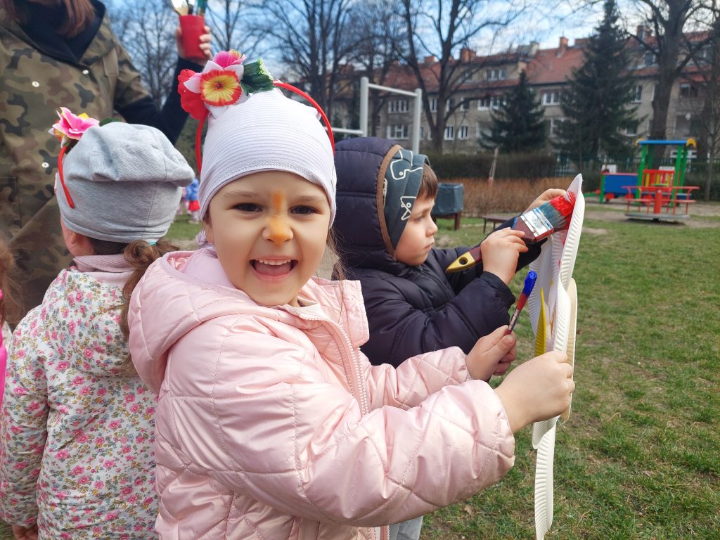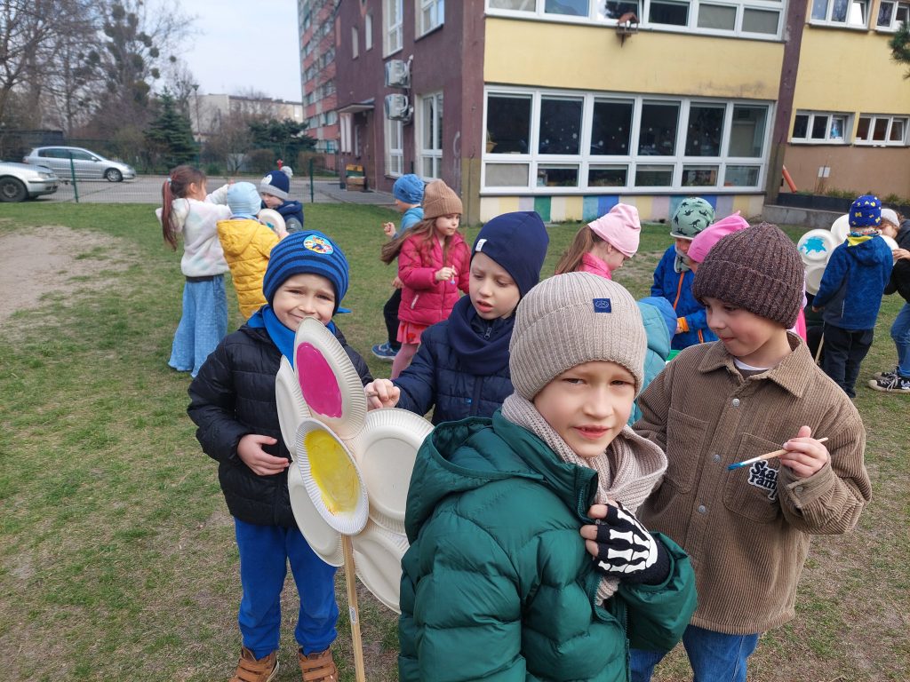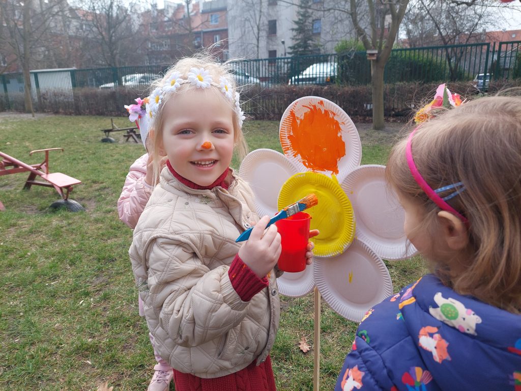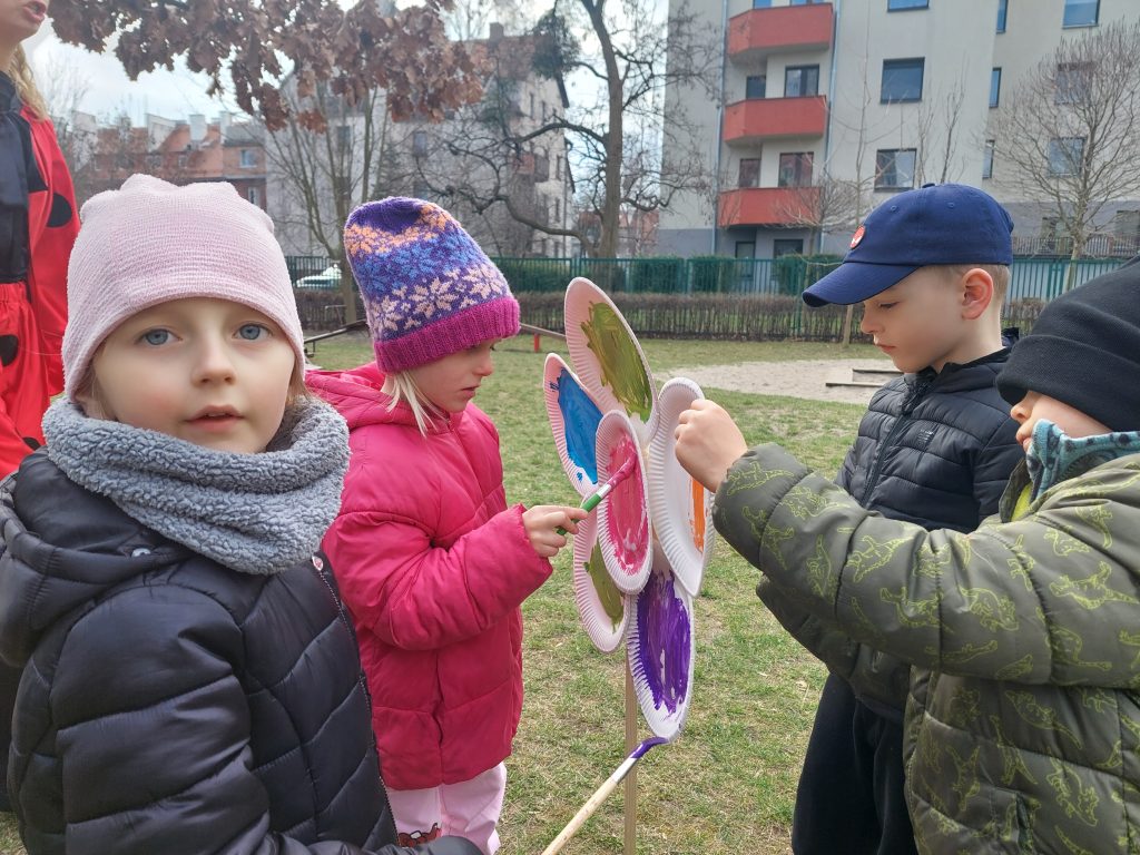 Wiosną owady wybudzają się z zimowej hibernacji (pauzy), opuszczają swoje kryjówki – korę drzew, ściółkę, mrowiska czy domowe zakamarki – i intensywnie poszukują pożywienia i miejsc do rozrodu. O godz.10:00 wszystkie przedszkolaki spotykały się w ogrodzie przedszkolnym, gdzie czekała na nich pięknie ukwiecona Pani Wiosna. Na taras przyleciała pszczoła i opowiadała dzieciom, że nie spała całą zimę tylko ogrzewała królową i siostry w ulu. Bardzo głodna dostrzega kwiatki i zaczęła zbierać pyłek. Dzieci zaśpiewały wesołą piosenkę i postanowiły obudzić pozostałe owady motyla i biedronkę. Po gromkim śpiewie na wybudzenie biedronka opowiedziała co robi wiosną i dlaczego nie je nektaru z kwiatków jak motyl i pszczoła. Motylek również wyjaśnił jaką aktywność ma na wiosną. Podczas zabawy z elementami scenek teatralnych i przy muzyce dzieci miały możliwość rozwijania zainteresowań otaczającym środowiskiem przyrodniczym oraz zachodzącymi w nim zmianami. Dzieci zostały zachęcone do pomalowania stojących papierowych kwiatów. Malowanie farbami, tańce i zabawy na świeżym powietrzu integrowały całą społeczność przedszkolną we wspólnym przeżywaniu witania wiosny.