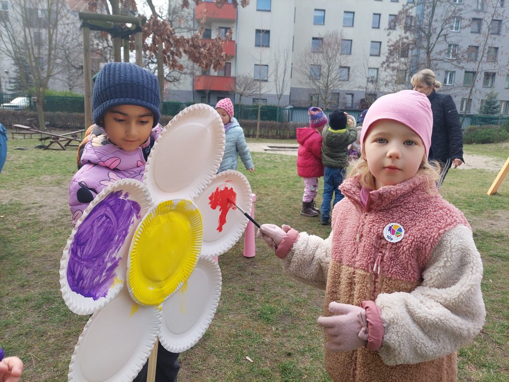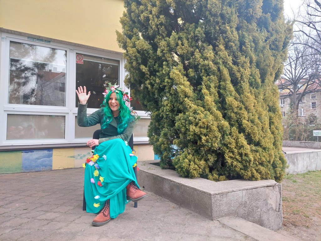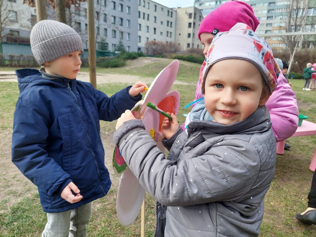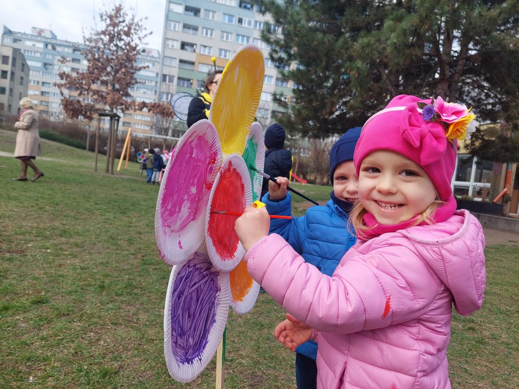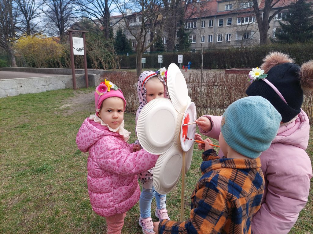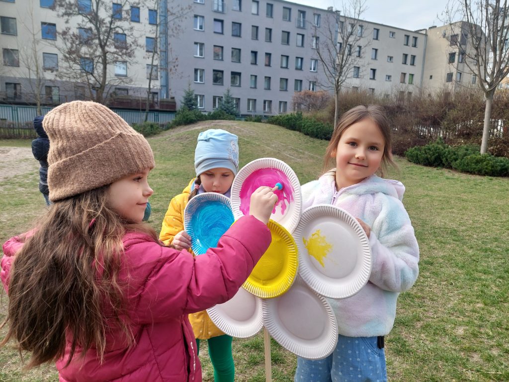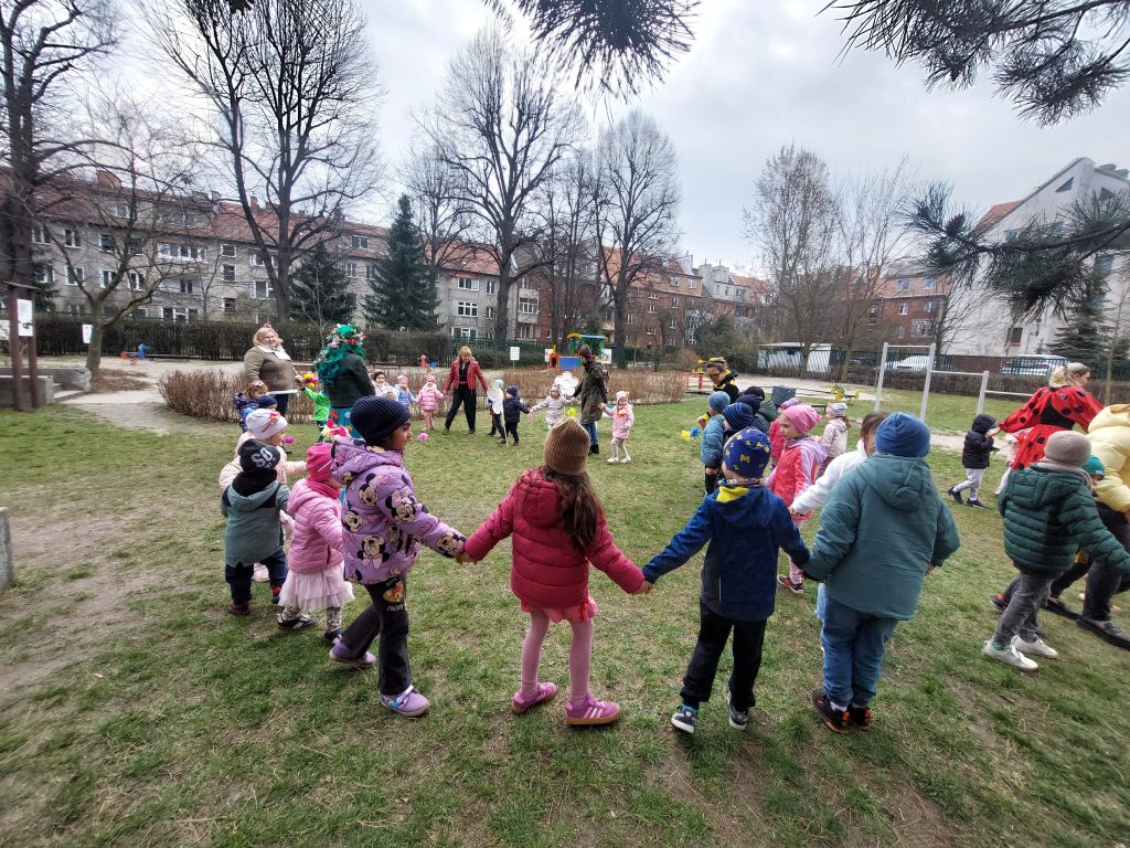Wiosną owady wybudzają się z zimowej hibernacji (pauzy), opuszczają swoje kryjówki – korę drzew, ściółkę, mrowiska czy domowe zakamarki – i intensywnie poszukują pożywienia i miejsc do rozrodu. O godz.10:00 wszystkie przedszkolaki spotykały się w ogrodzie przedszkolnym, gdzie czekała na nich pięknie ukwiecona Pani Wiosna. Na taras przyleciała pszczoła i opowiadała dzieciom, że nie spała całą zimę tylko ogrzewała królową i siostry w ulu. Bardzo głodna dostrzega kwiatki i zaczęła zbierać pyłek. Dzieci zaśpiewały wesołą piosenkę i postanowiły obudzić pozostałe owady motyla i biedronkę. Po gromkim śpiewie na wybudzenie biedronka opowiedziała co robi wiosną i dlaczego nie je nektaru z kwiatków jak motyl i pszczoła. Motylek również wyjaśnił jaką aktywność ma na wiosną. Podczas zabawy z elementami scenek teatralnych i przy muzyce dzieci miały możliwość rozwijania zainteresowań otaczającym środowiskiem przyrodniczym oraz zachodzącymi w nim zmianami. Dzieci zostały zachęcone do pomalowania stojących papierowych kwiatów. Malowanie farbami, tańce i zabawy na świeżym powietrzu integrowały całą społeczność przedszkolną we wspólnym przeżywaniu witania wiosny.