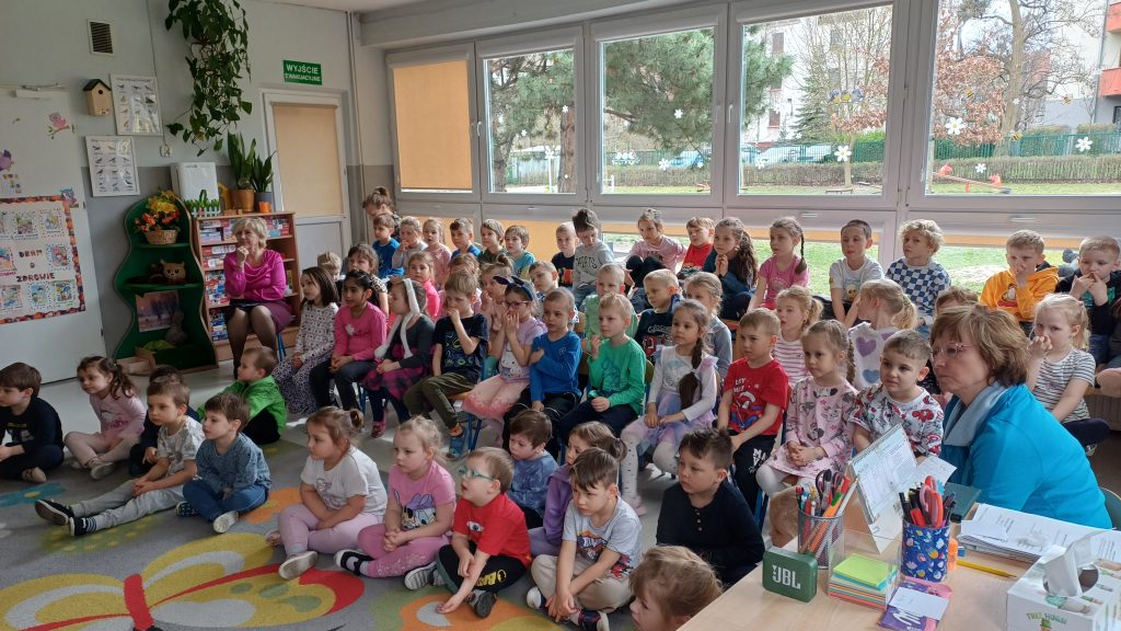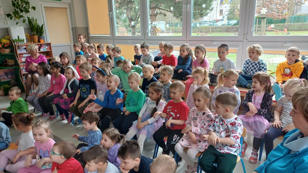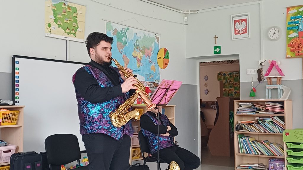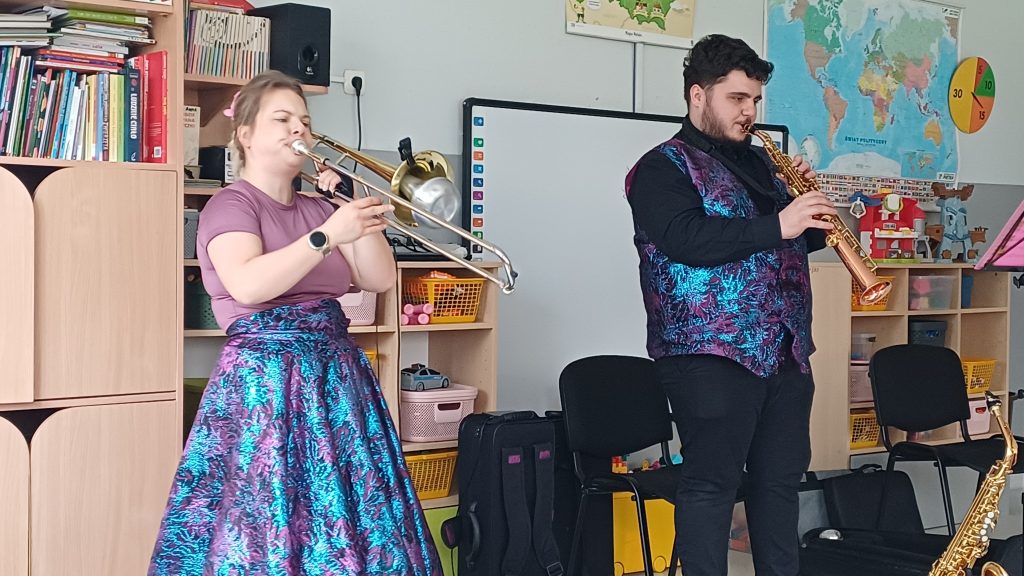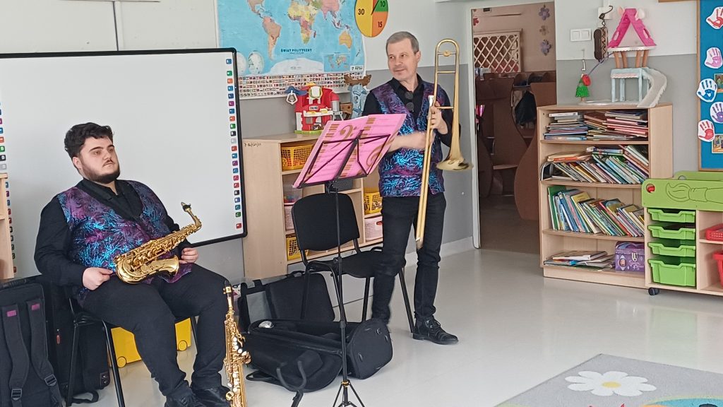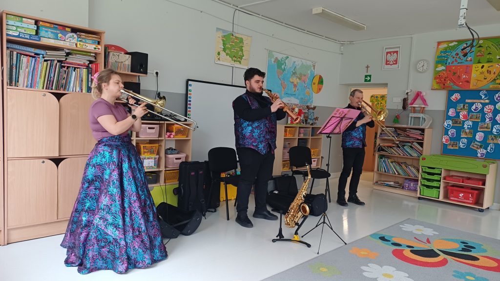 25 marca przeżyliśmy w naszym przedszkolu kolejne wyjątkowe spotkanie z muzyką! Odbył się wspaniały koncert muzyczny, który przeniósł nas prosto do Królestwa Baśni. Odwiedzili nas znani już nam muzycy z Lubuskiego Biura Koncertowego „Orfeusz”. Tego dnia wysłuchaliśmy niezwykłej opowieści o Księżniczce zaklętej w żabę. Wędrując razem przez baśniowy świat, mogliśmy nie tylko poznać tę piękną historię, ale też odkryć czarodziejskie instrumenty muzyczne! Pani Muzyka pokazała nam puzon altowy i puzon tenorowy – to tacy instrumentowi bracia. Wyglądają bardzo podobnie i potrafią wydobywać cudowne, głębokie dźwięki. Nie zabrakło też saksofonu altowego i saksofonu sopranowego, które swoim brzmieniem potrafią rozśmieszyć, wzruszyć, a nawet rozruszać każdego! Podróż przez Krainę Baśni była pełna muzyki, magii, uśmiechów i świetnej zabawy! Oczywiście finał baśni był szczęśliwy i sprawiedliwy.