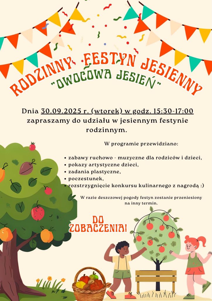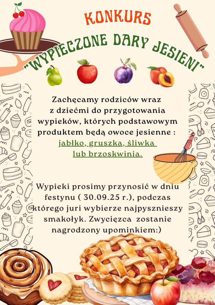 Zachęcamy rodziców wraz z dziećmi do przygotowania wypieków, których podstawowym produktem będą owoce jesienne : jabłko, gruszka, śliwka lub brzoskwinia. Szczegóły na plakacie! :)
